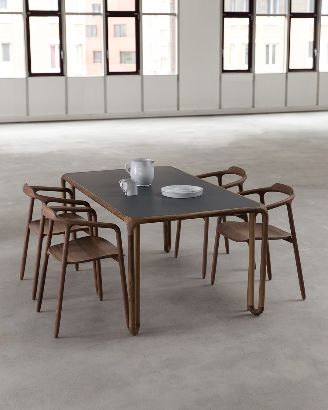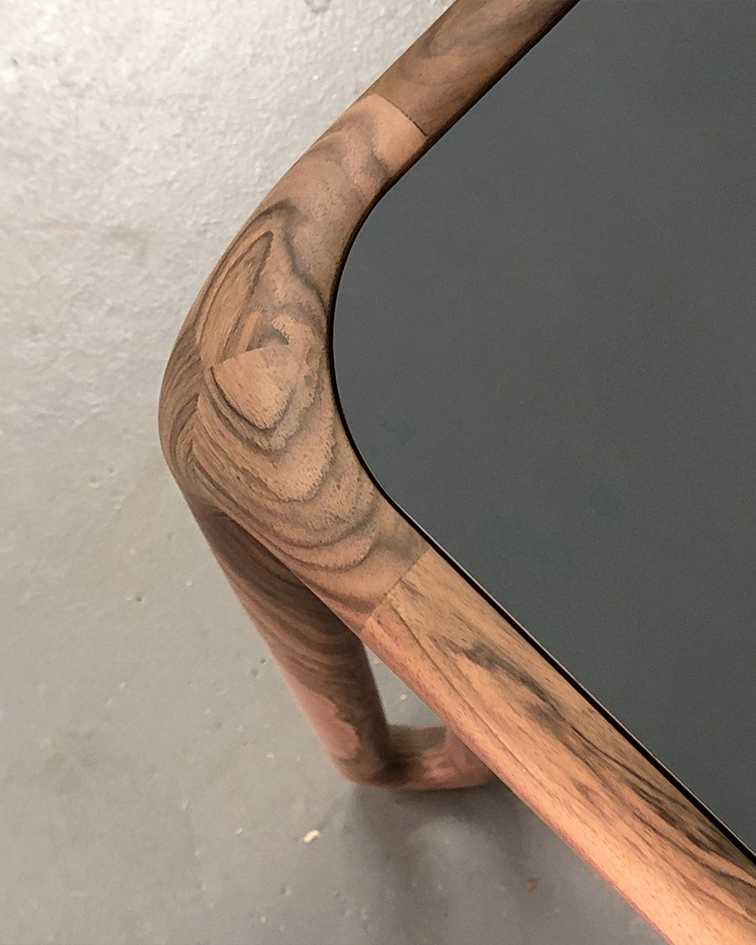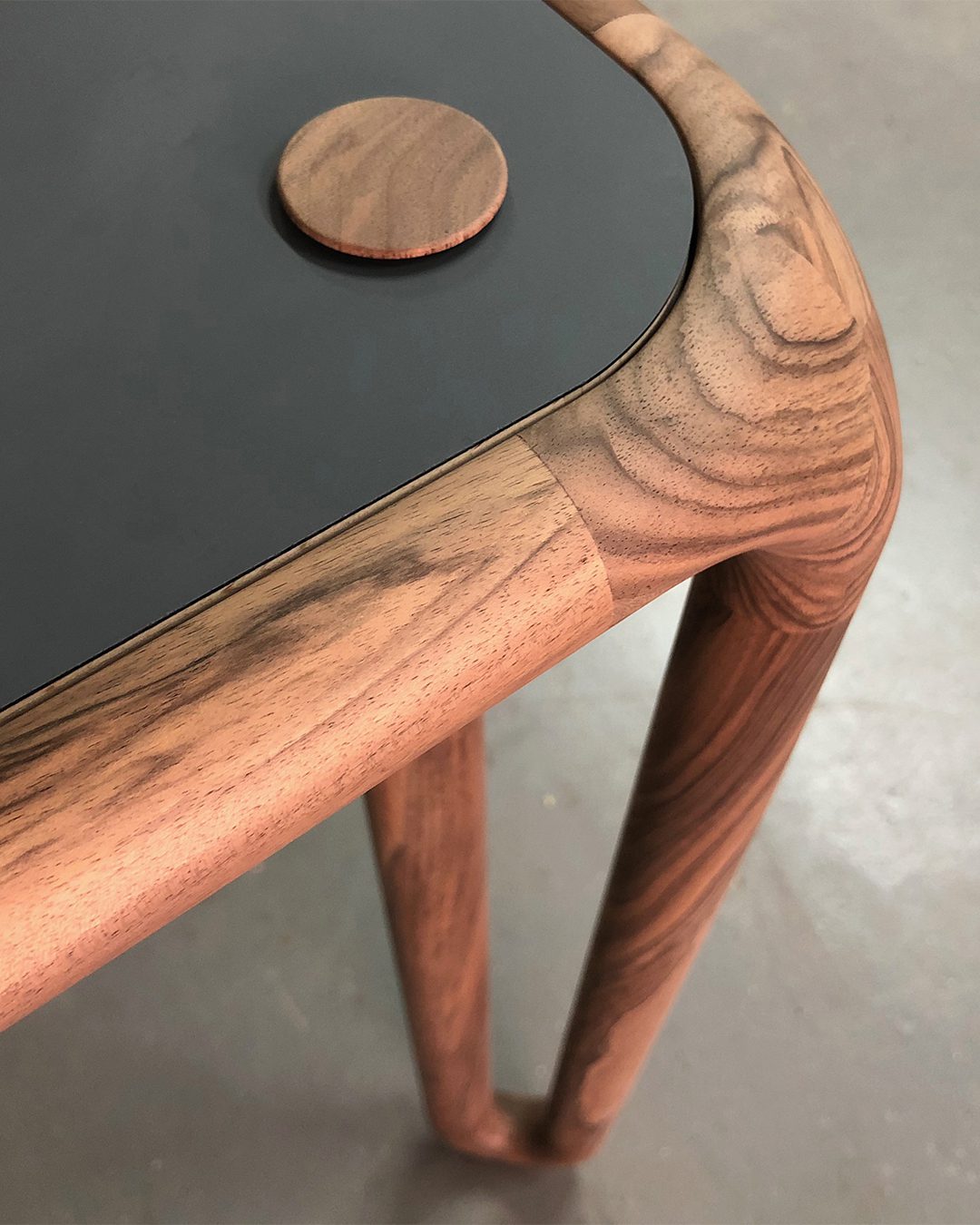 La fantaisie de cette table tient dans son piétement. Une boucle semble ressortir par le plateau qui peut être en cuir, en pierre ou en materiau composite. Véritable prouesse qui met en valeur le talent du travail de l’ébéniste.