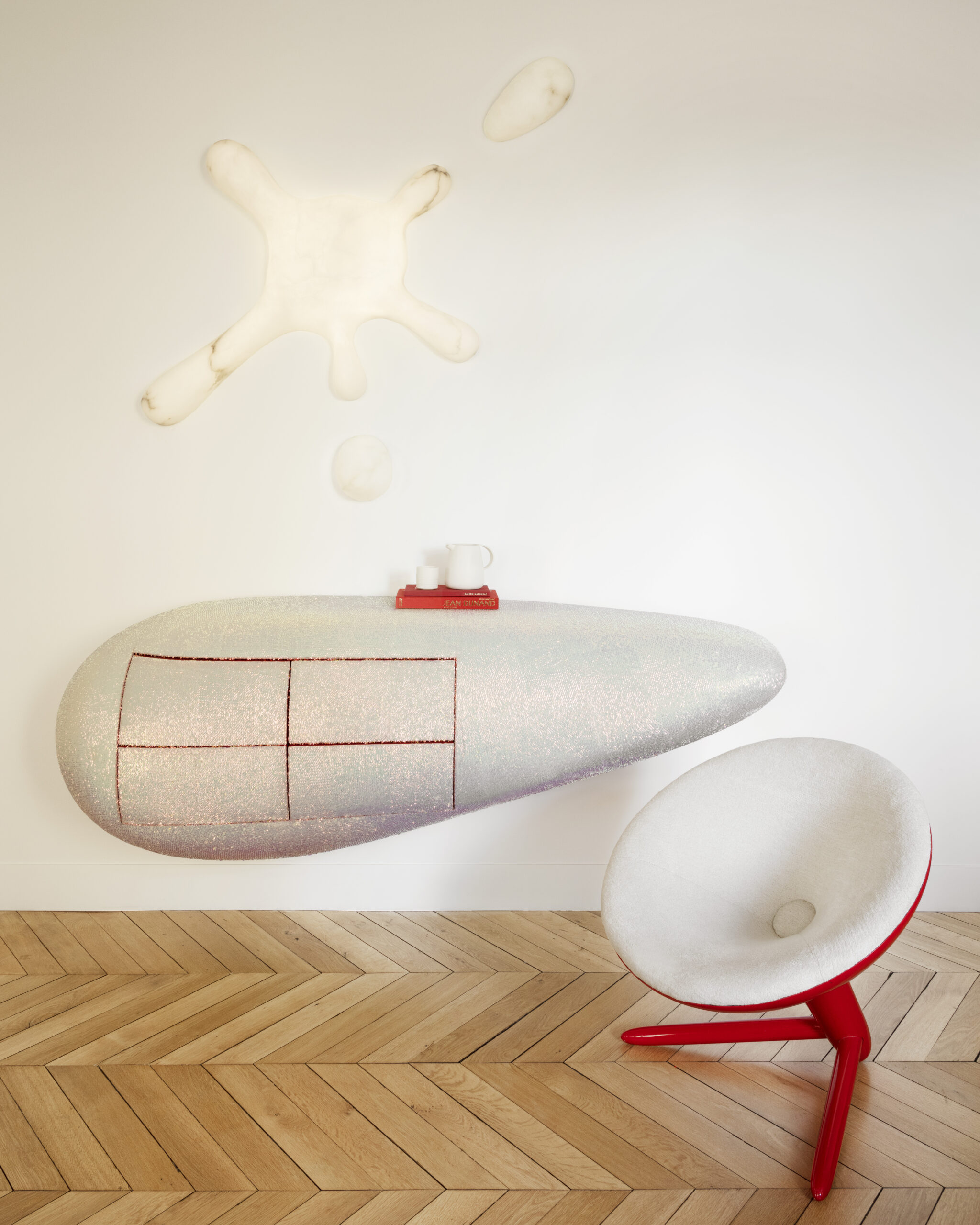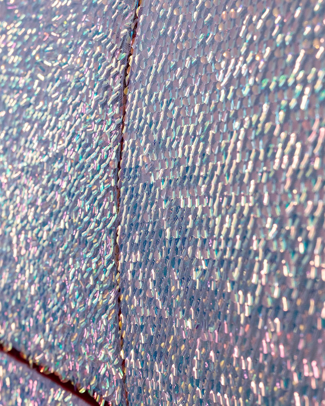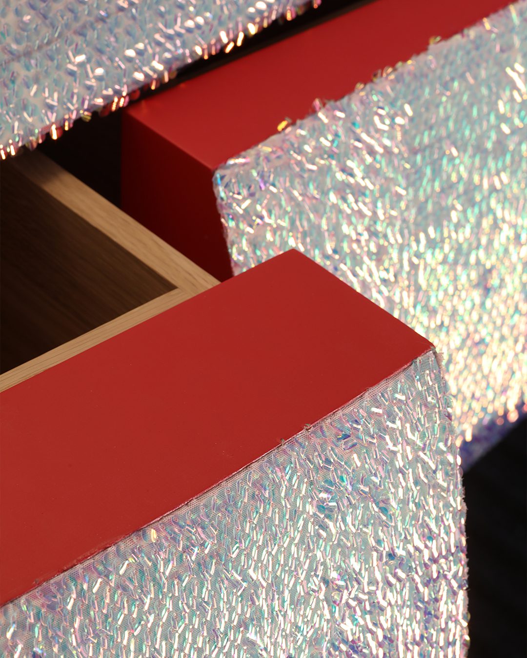 La commode Hollywood est une pièce de haute couture qui s’exprime à travers un choix de matières raffinées : structure en chêne et revêtement cousu en sequins. Elle dispose de quatre tiroirs intérieurs en laque rouge.