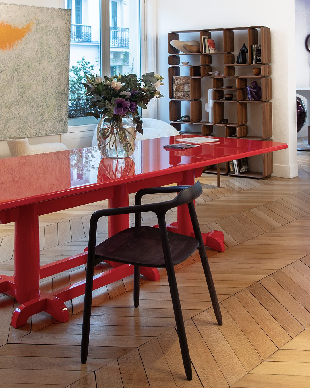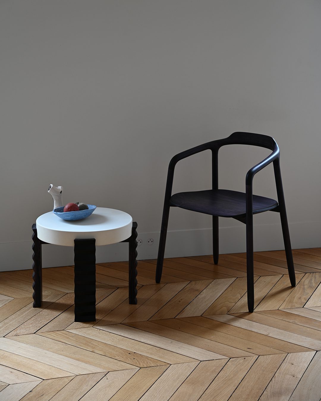 Ce fauteuil emblématique de la collection Franck Genser, inspiré par le travail de Ruhlmann, met en évidence le contraste entre modernité et tradition. La chaise trouve son équilibre en 2 pièces et 4 pieds sculptés dans des volumes de bois massif.