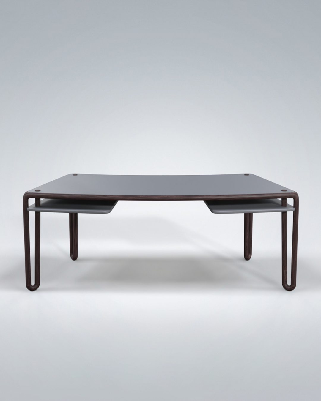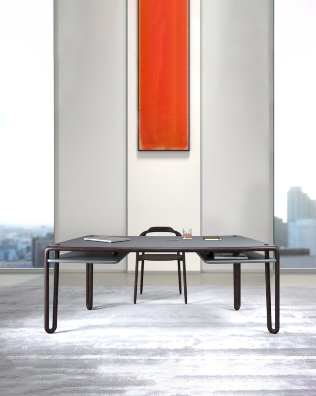 The whimsy of this table lies in its base. A loop appears to emerge through the tabletop, which can be made of leather, stone, or composite material. It’s a true feat that highlights the craftsmanship and talent of the cabinetmaker.