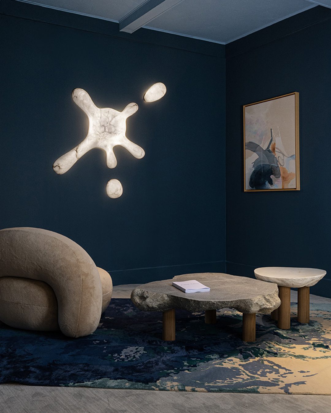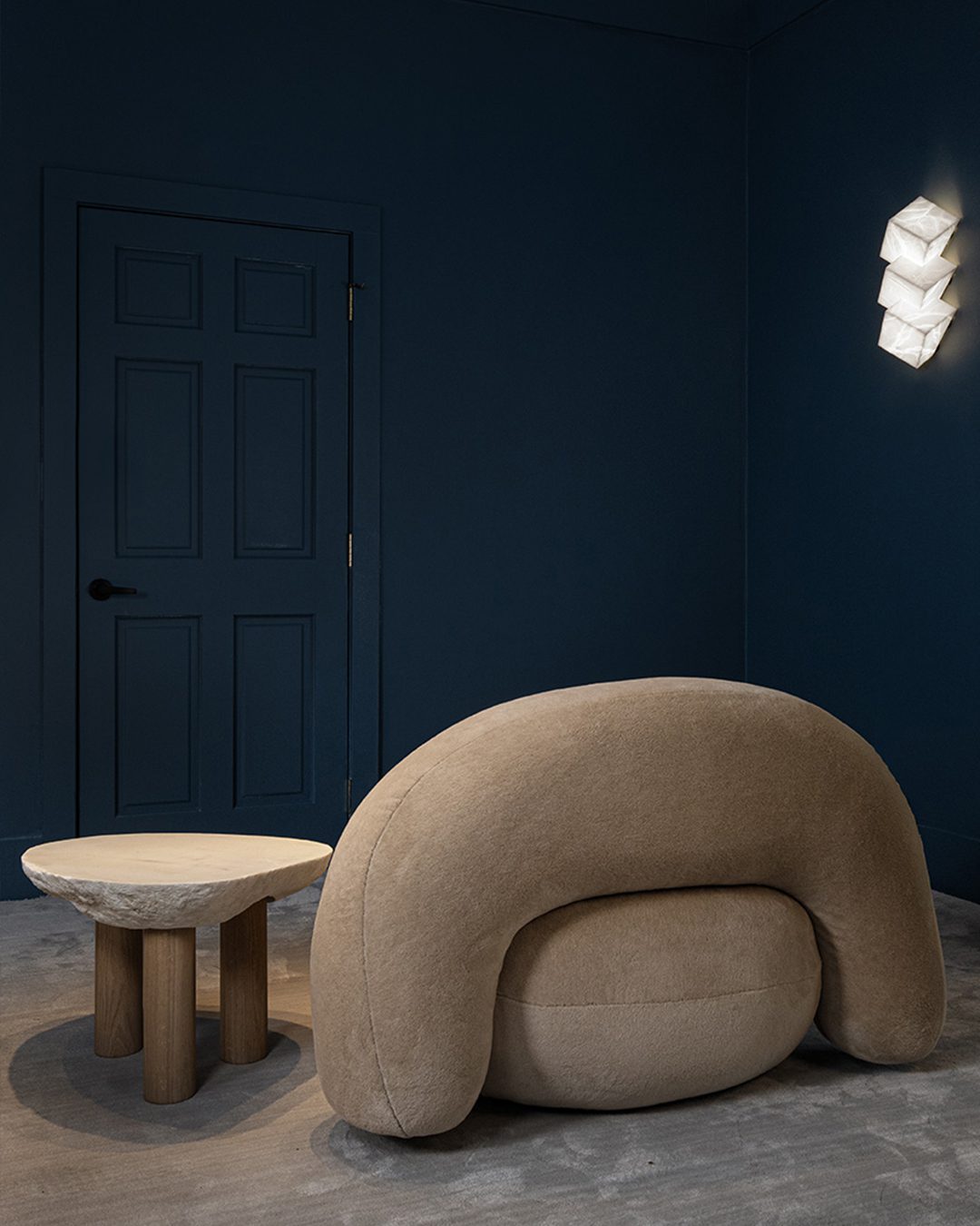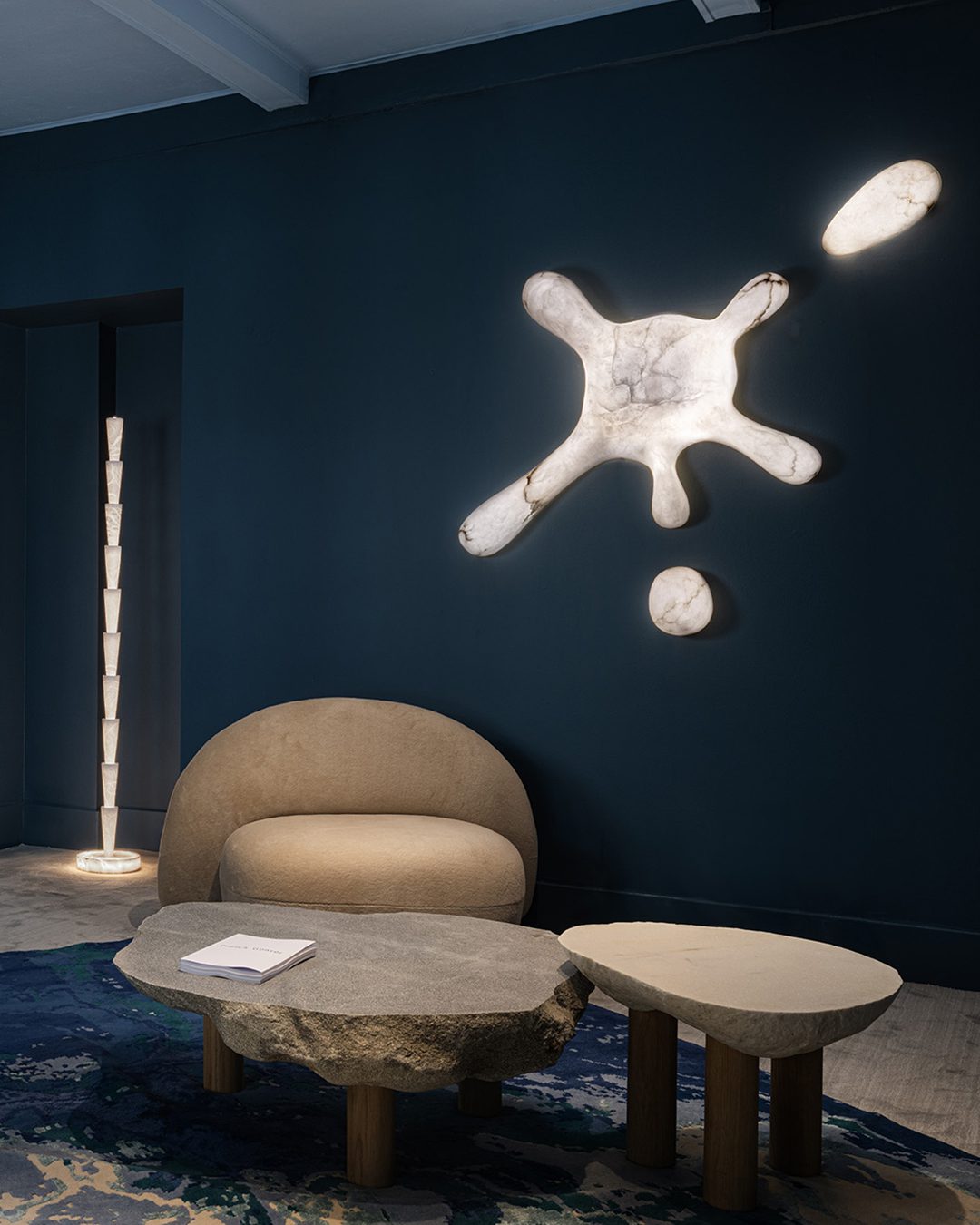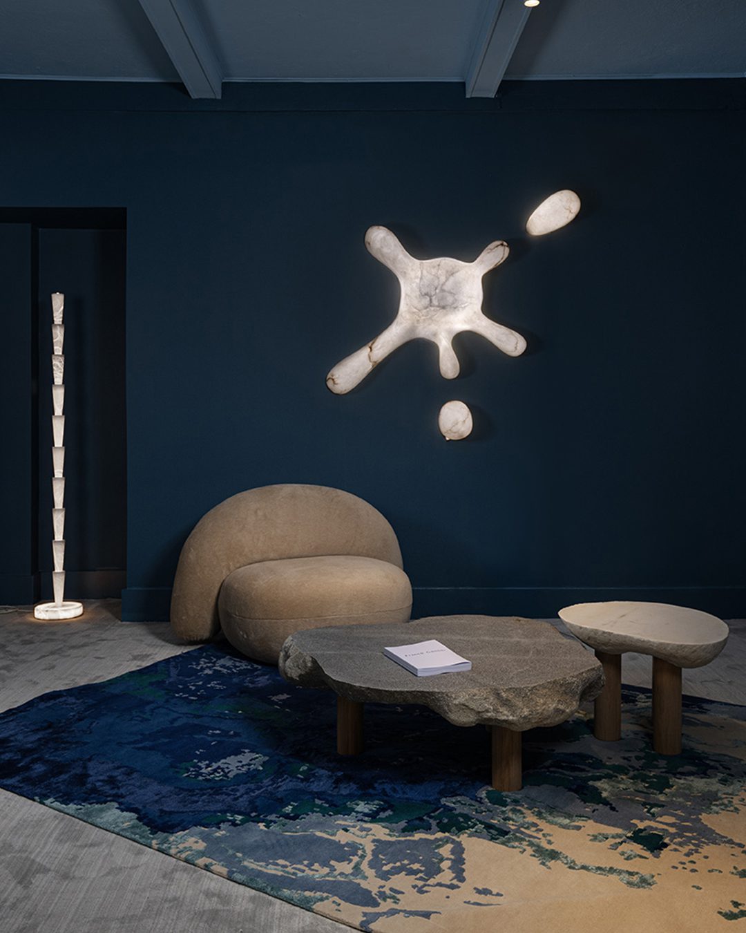 More compact and aerial, the brutalist coffee table in white marble plays on the dialogue between strength and softness. Its top, carved from a naturally eroded stone, retains an organic, irregular edge, while the softened upper surface gently catches the light. Resting on three solid-oak cylindrical legs, it combines the mineral presence of marble with the warmth of wood, resulting in a piece that is both sculptural and intimate. Each table is strictly unique: the marble veining, contours and thickness differ from one piece to another, ensuring that every interior is graced with a singular work, shaped by nature and revealed by the Atelier Franck Genser.