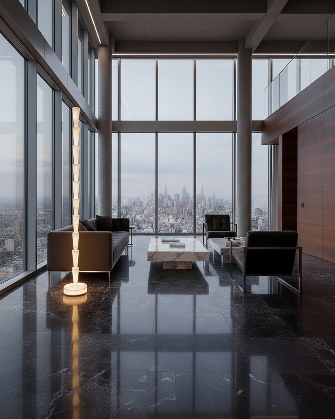 Cascade Finie extends the collection, originally inspired by Japanese rain chains, into a floor lamp. A vertical string of alabaster cones set on a base, it stands 190 cm tall. The stone diffuses a gentle light along the entire column. Slender silhouette, sculptural presence.