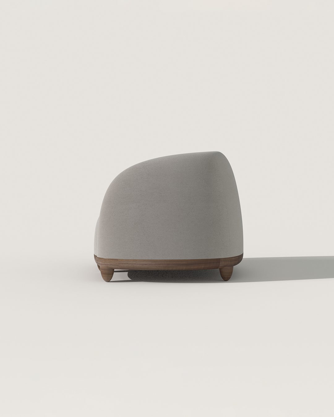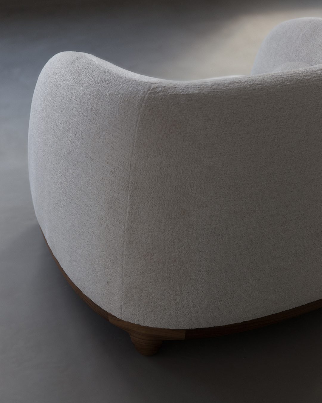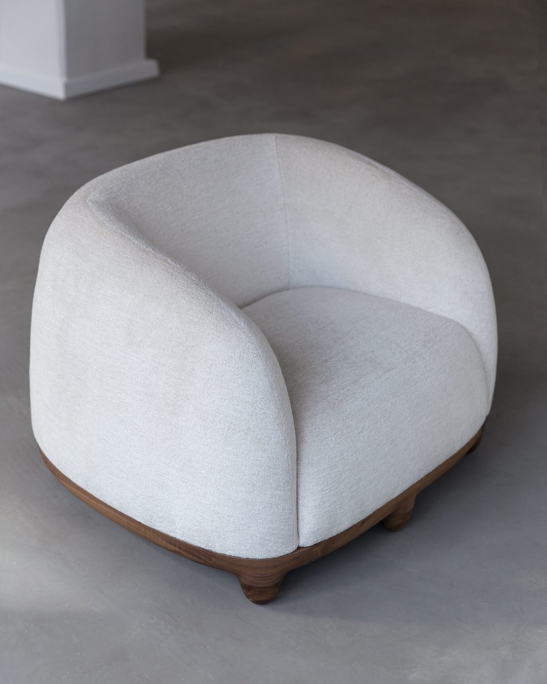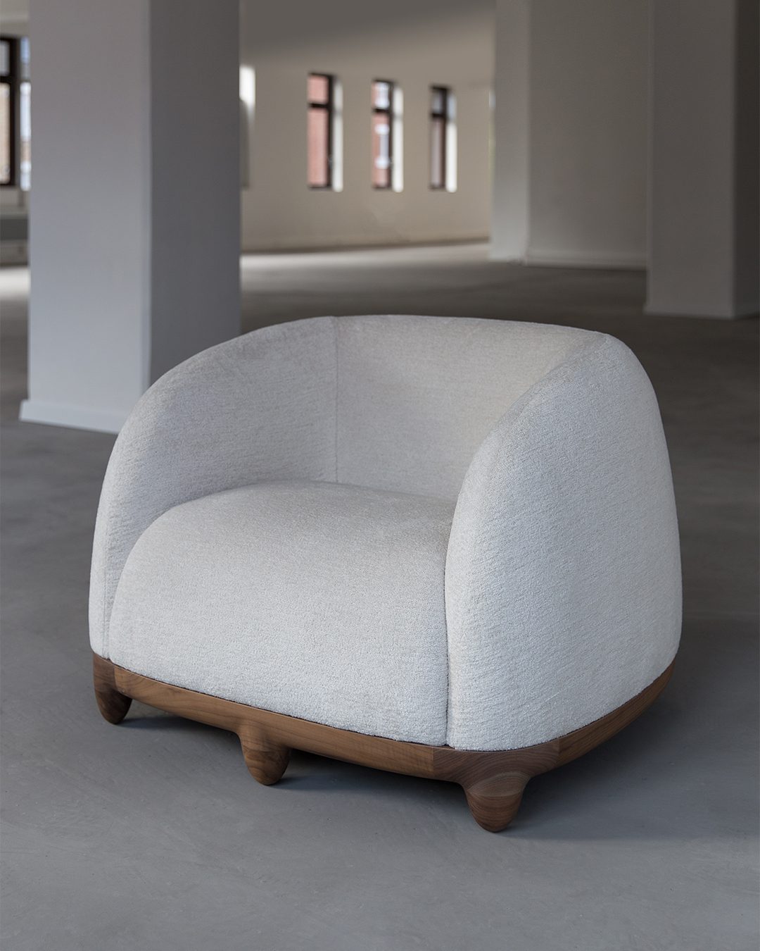 The starting point of the Chance armchair is comfort. The clean, curved forms of this armchair are designed to support the body, providing both firm and welcoming seating. It is presented here with a walnut frame and legs, upholstered in Pierre Frey bouclé fabric. The seating evokes French elegance, the durability of walnut, and the delicacy of exceptional craftsmanship and materials.