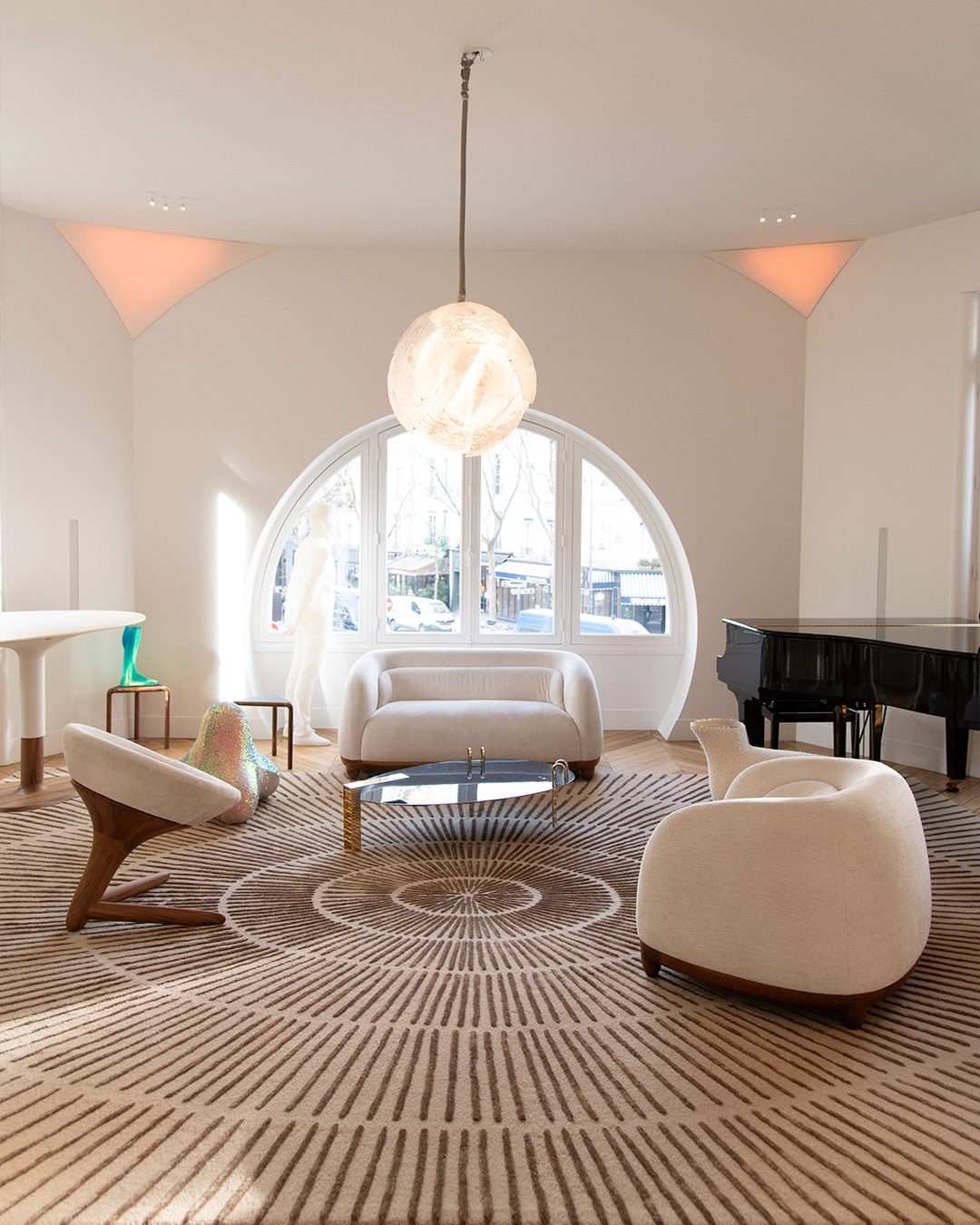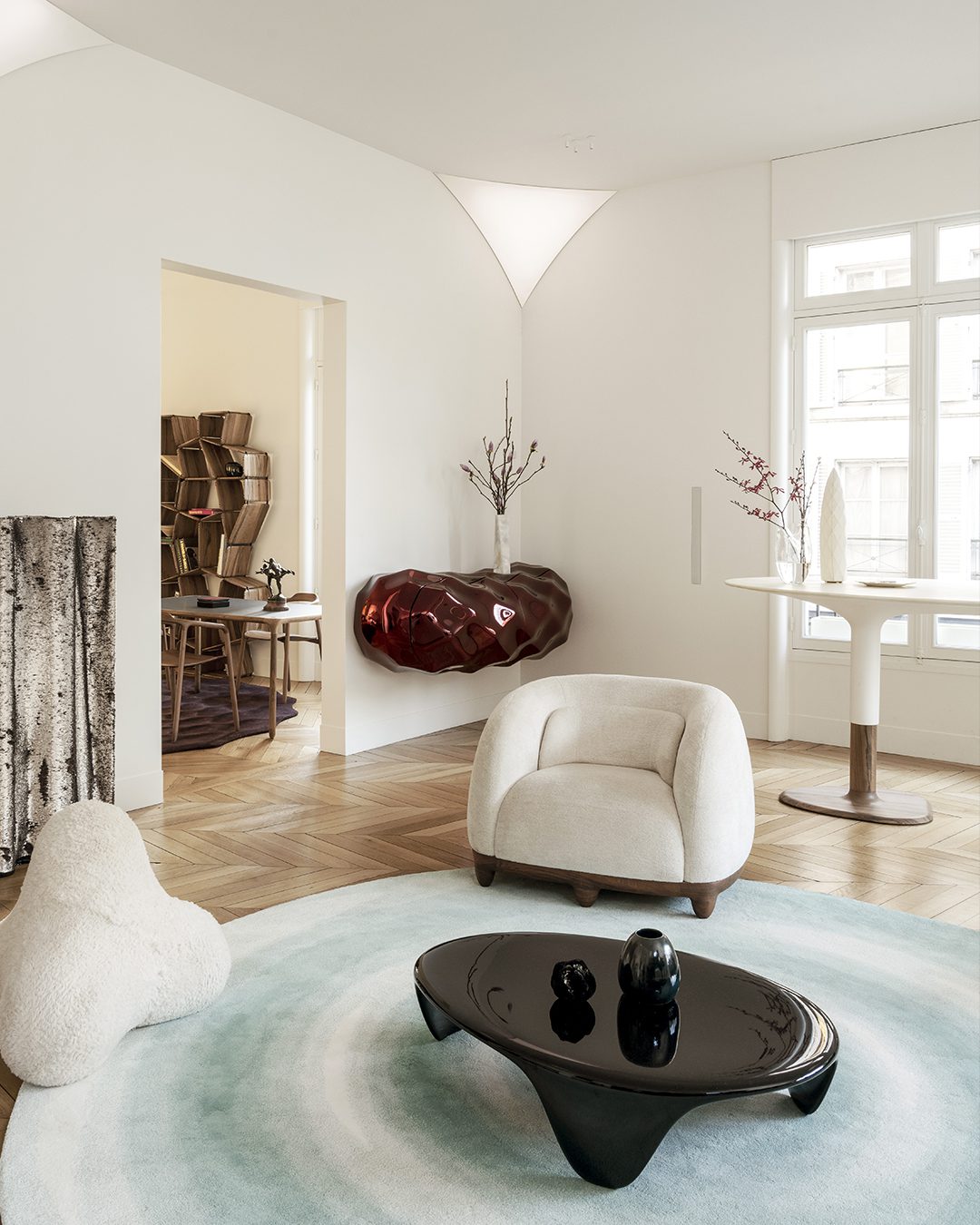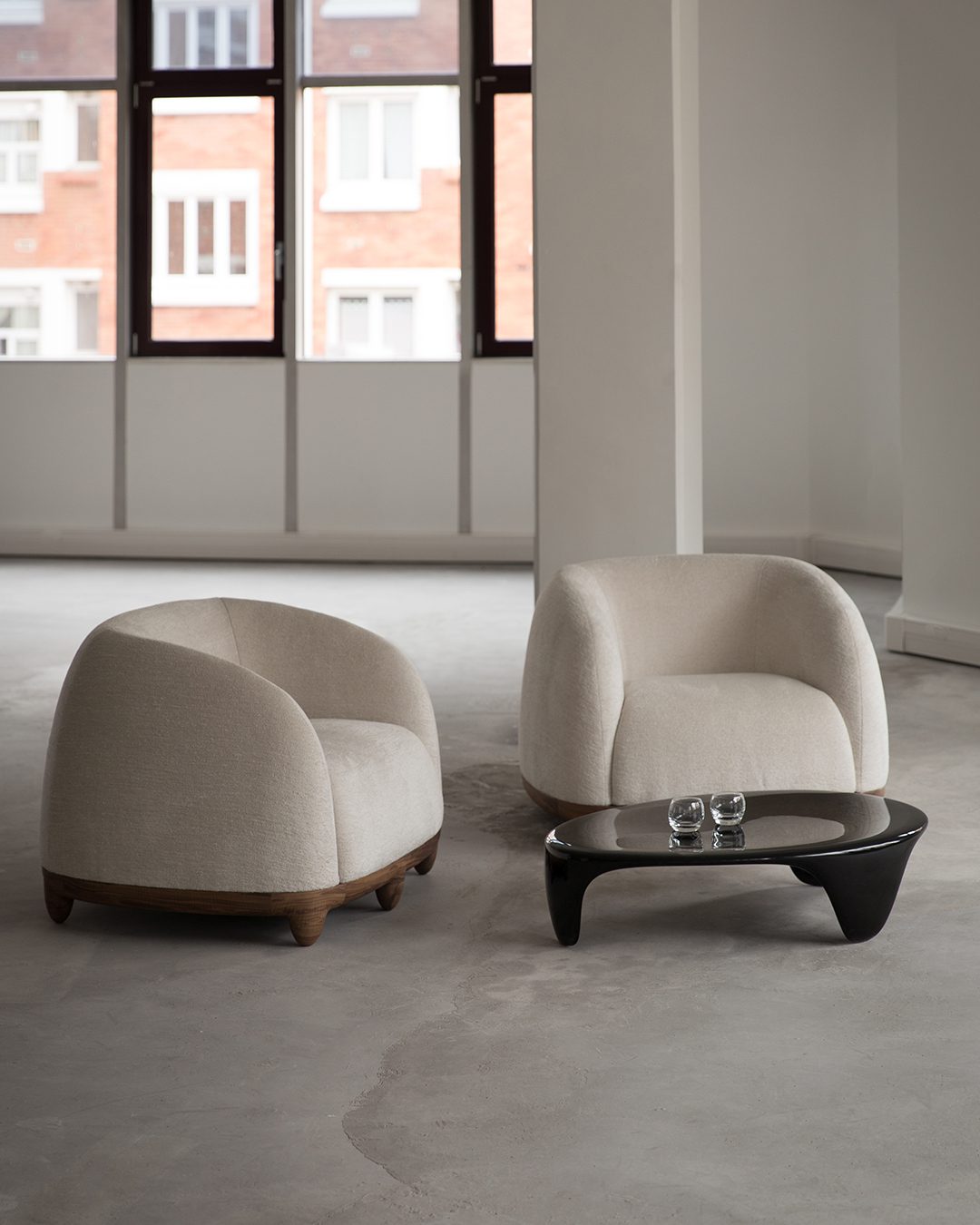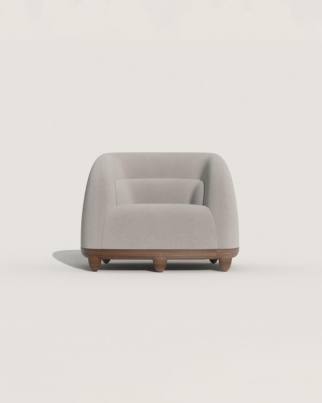 The starting point of the Chance armchair is comfort. The clean, curved forms of this armchair are designed to support the body, providing both firm and welcoming seating. It is presented here with a walnut frame and legs, upholstered in Pierre Frey bouclé fabric. The seating evokes French elegance, the durability of walnut, and the delicacy of exceptional craftsmanship and materials.