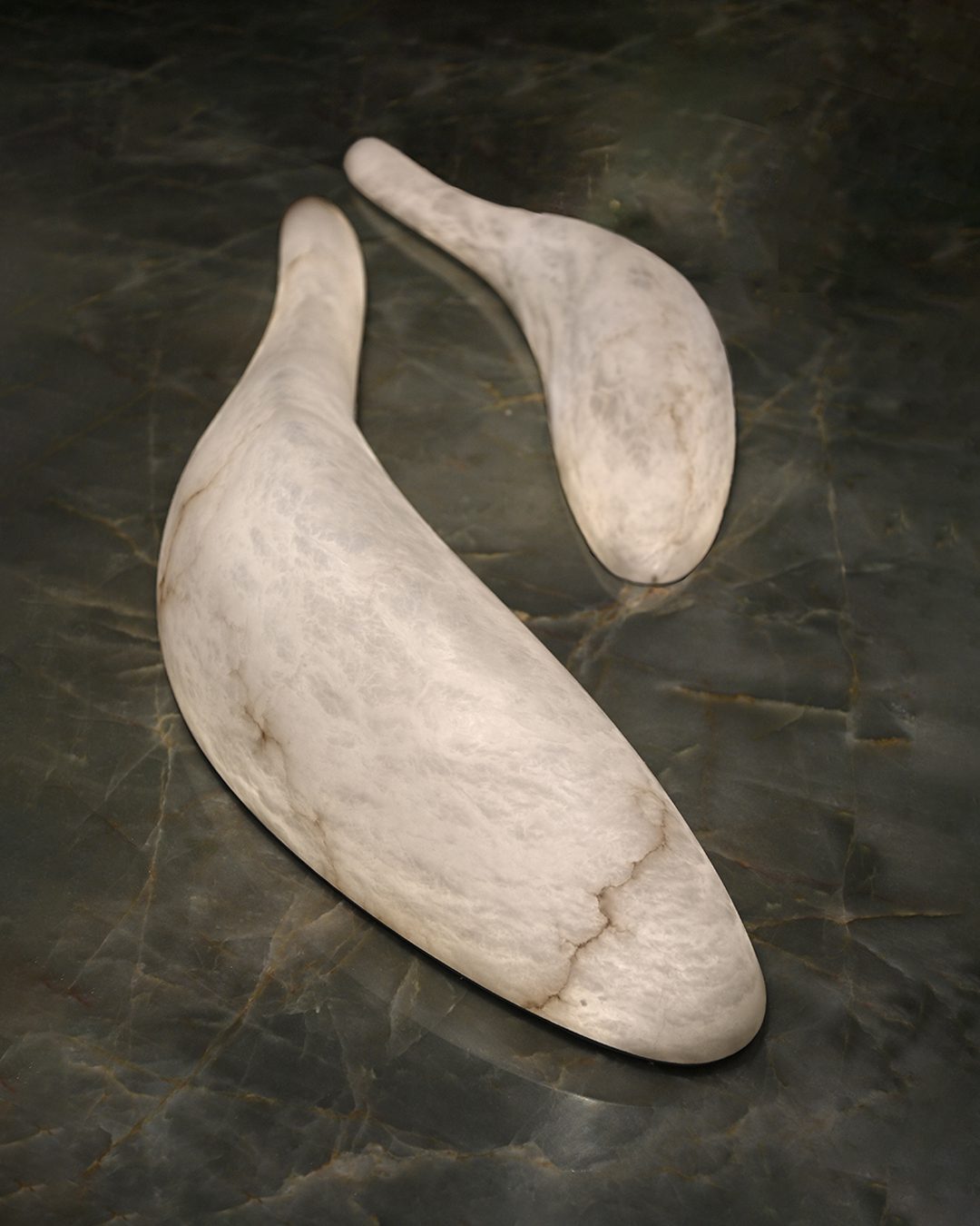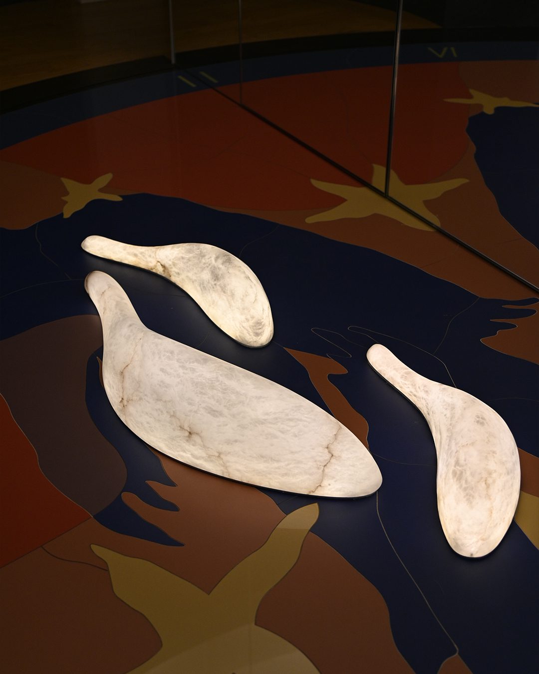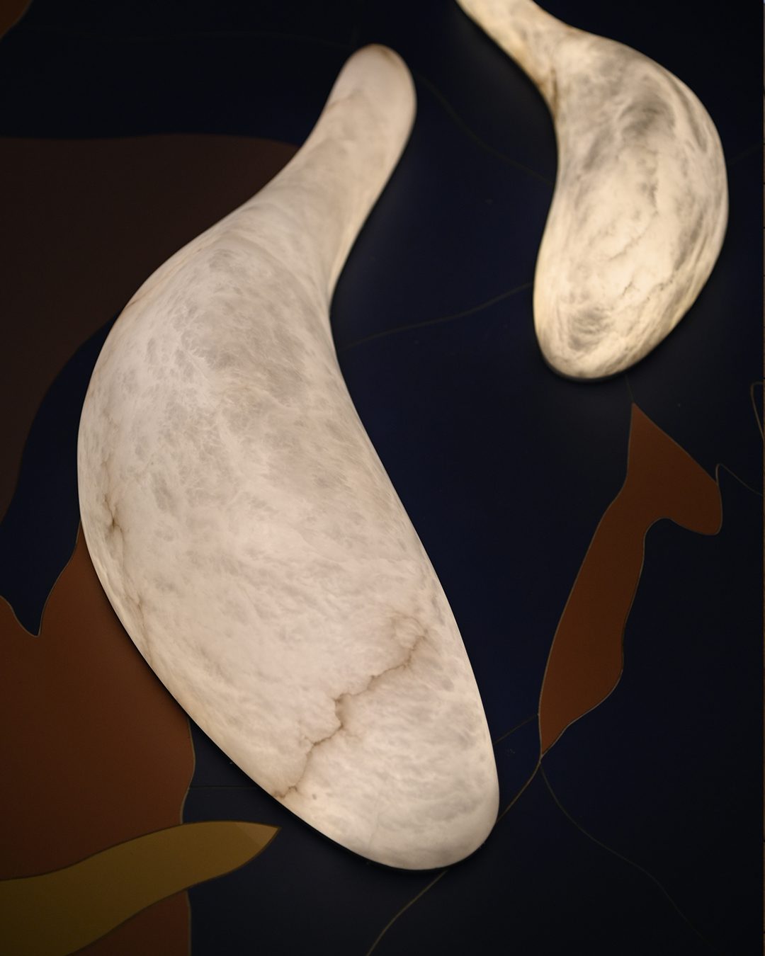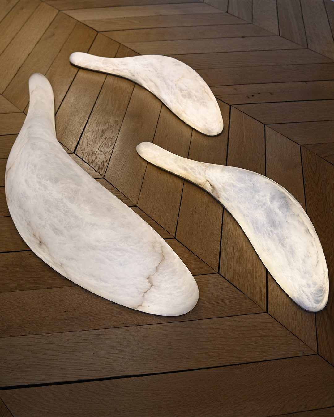 Our workshop hand-sculpts alabaster, selecting the most beautiful stones. Inspired by the craftsmanship of the 1920s, we reveal the material through polishing and material removal. In addition to lighting fixtures, we create illuminated logos and lettering, true mineral identities.