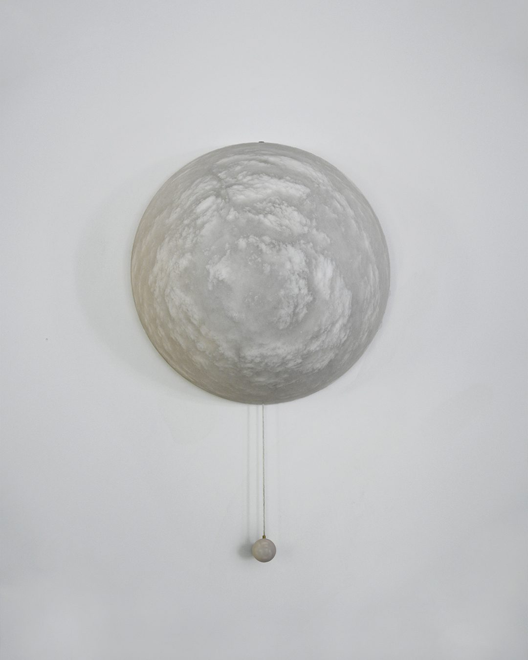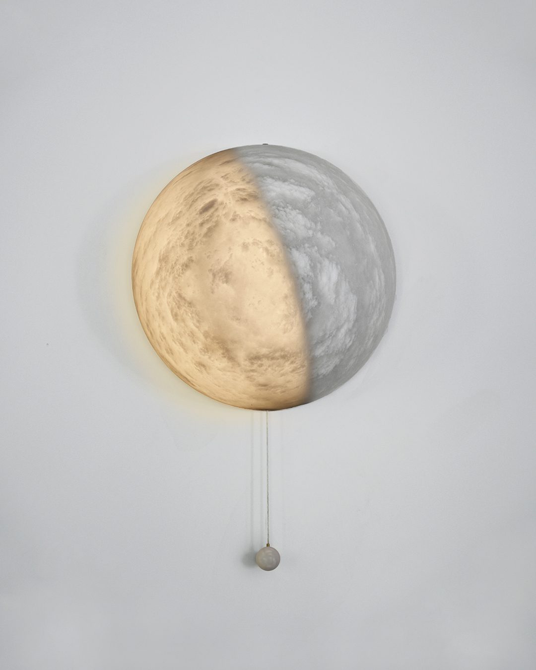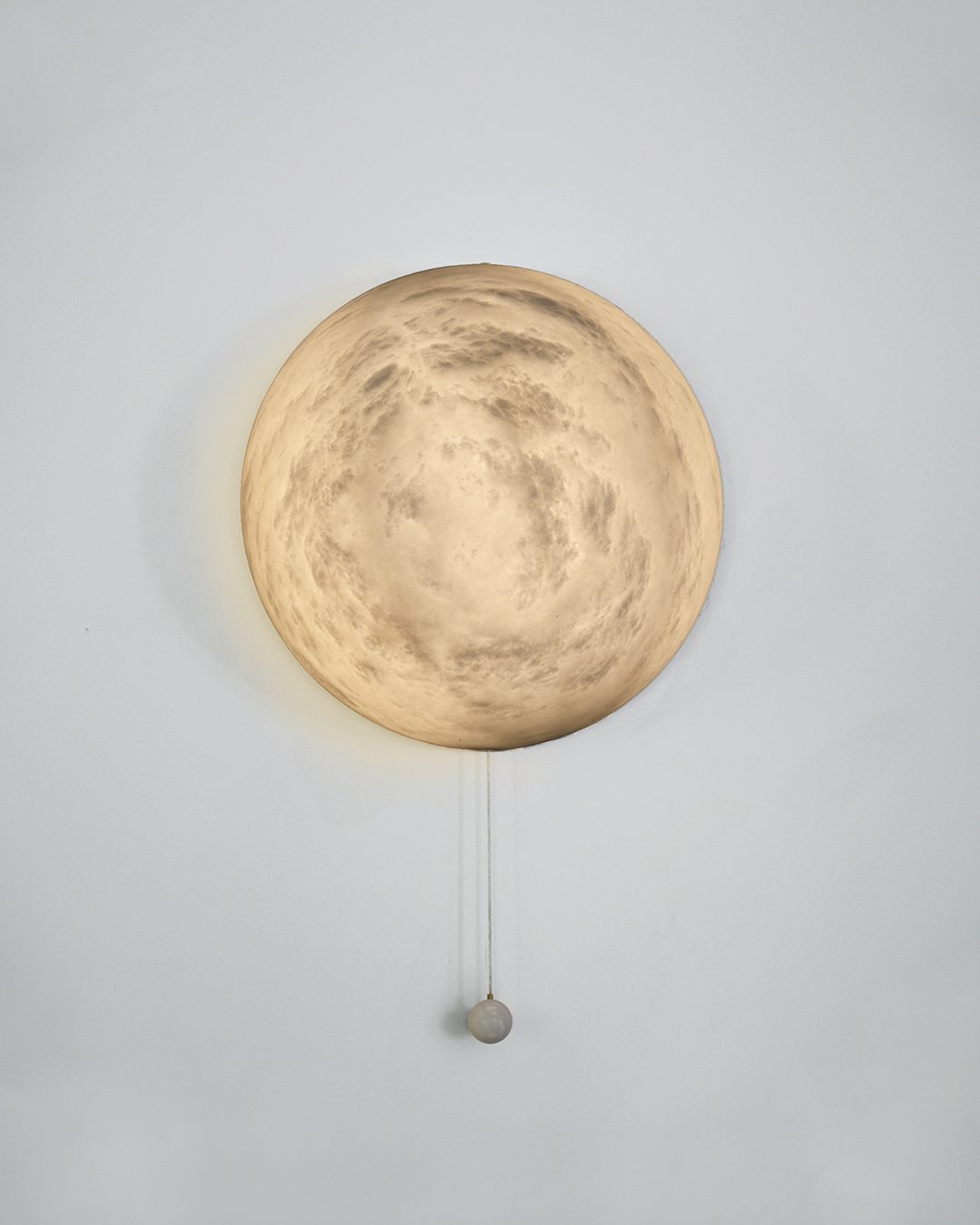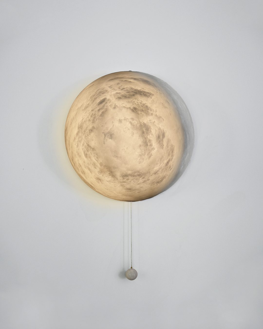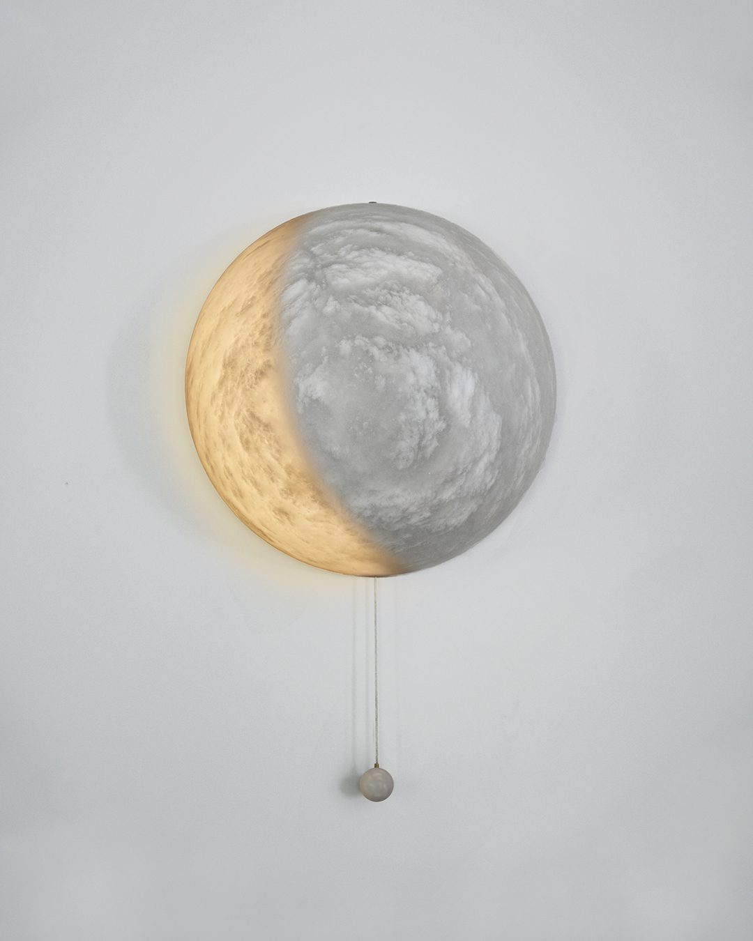 Moon interprets the phases of the moon. A backlit half-sphere carved from solid alabaster, it diffuses a soft light that reveals the stone’s veining. By pulling the cord, the intensity shifts and the piece moves from crescent to quarter to full moon.