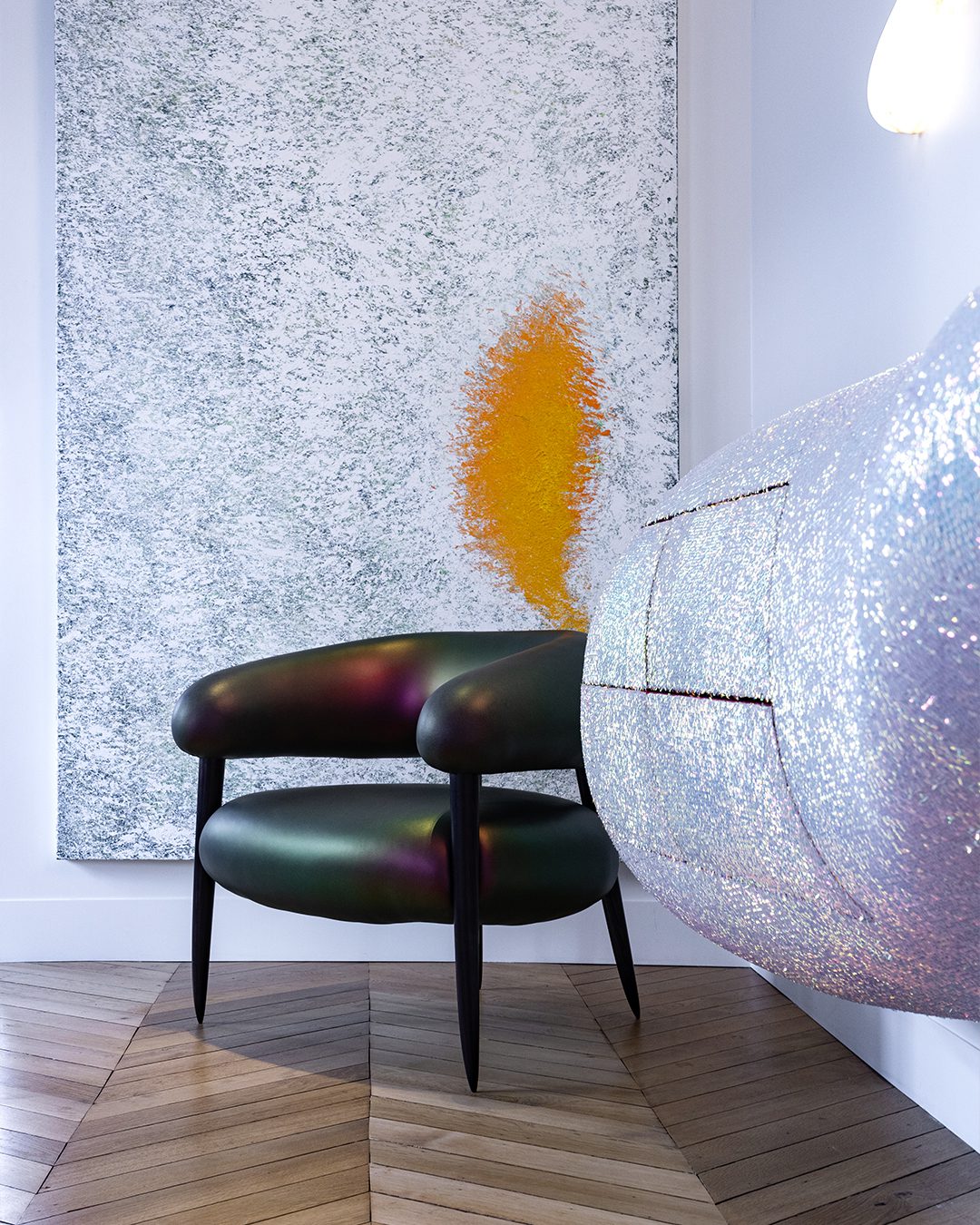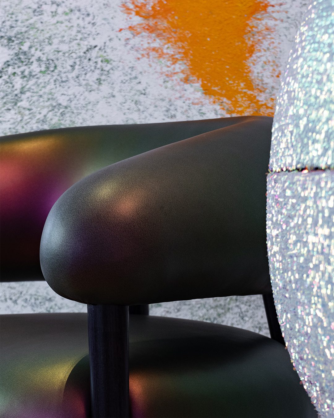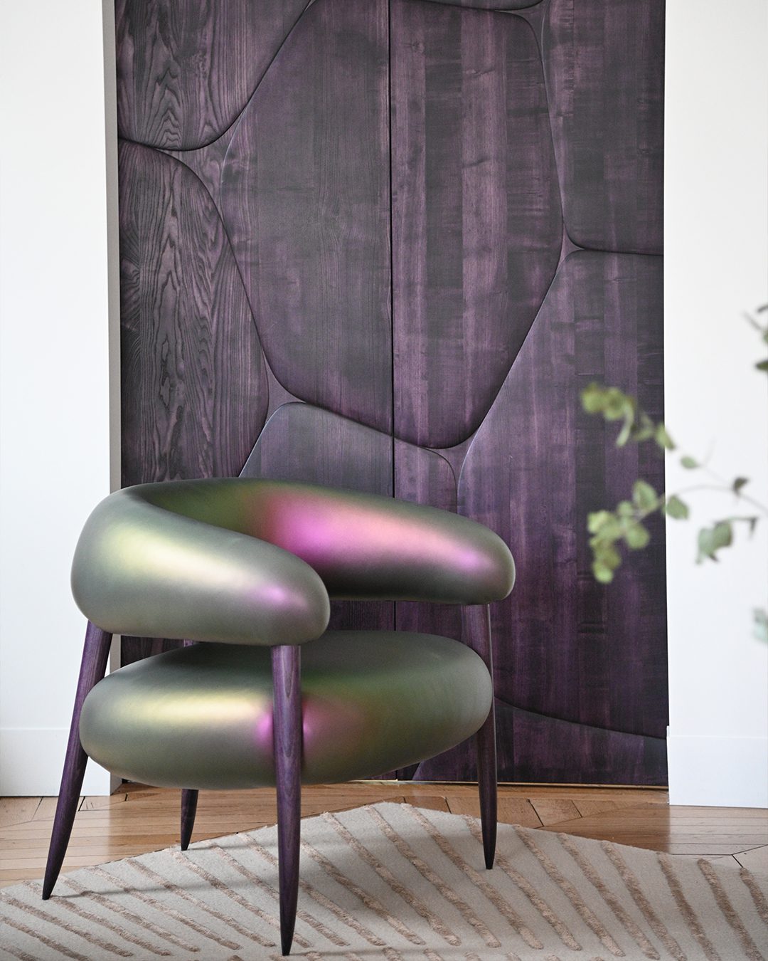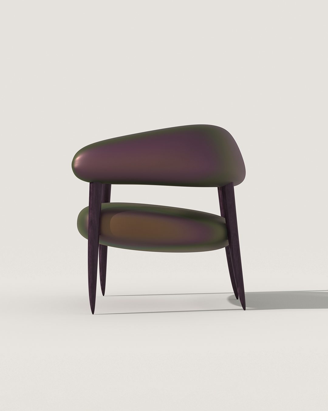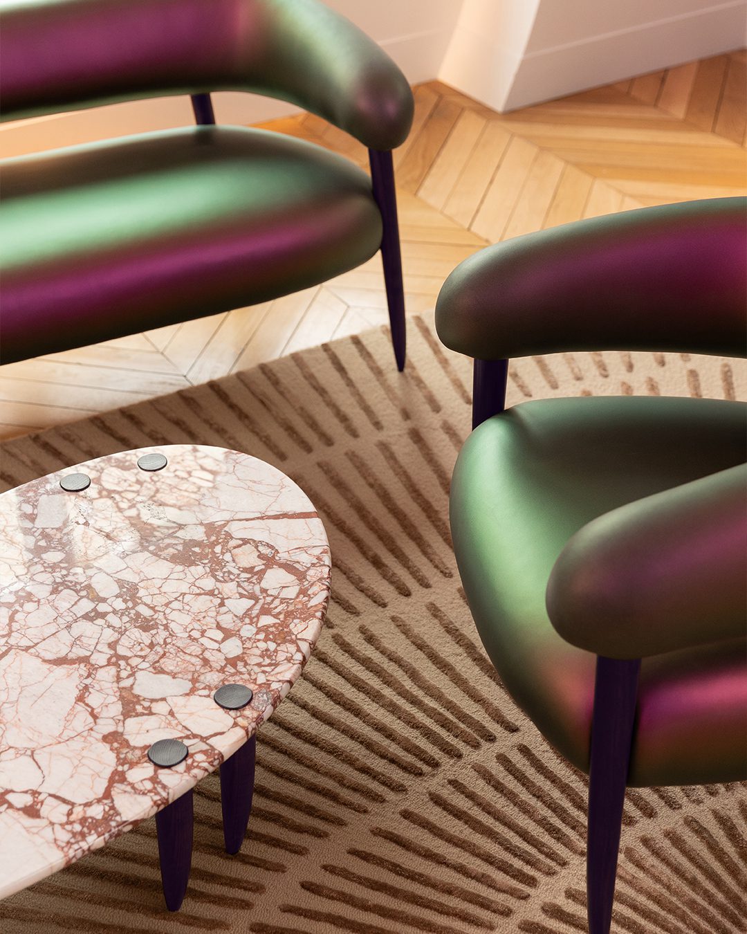 Tissu d’exception développé en exclusivité au Japon, le néoprène fait ici son entrée dans l’univers du siège — une première pour notre studio. Un textile technique devenu matière sensible, au service de la forme.