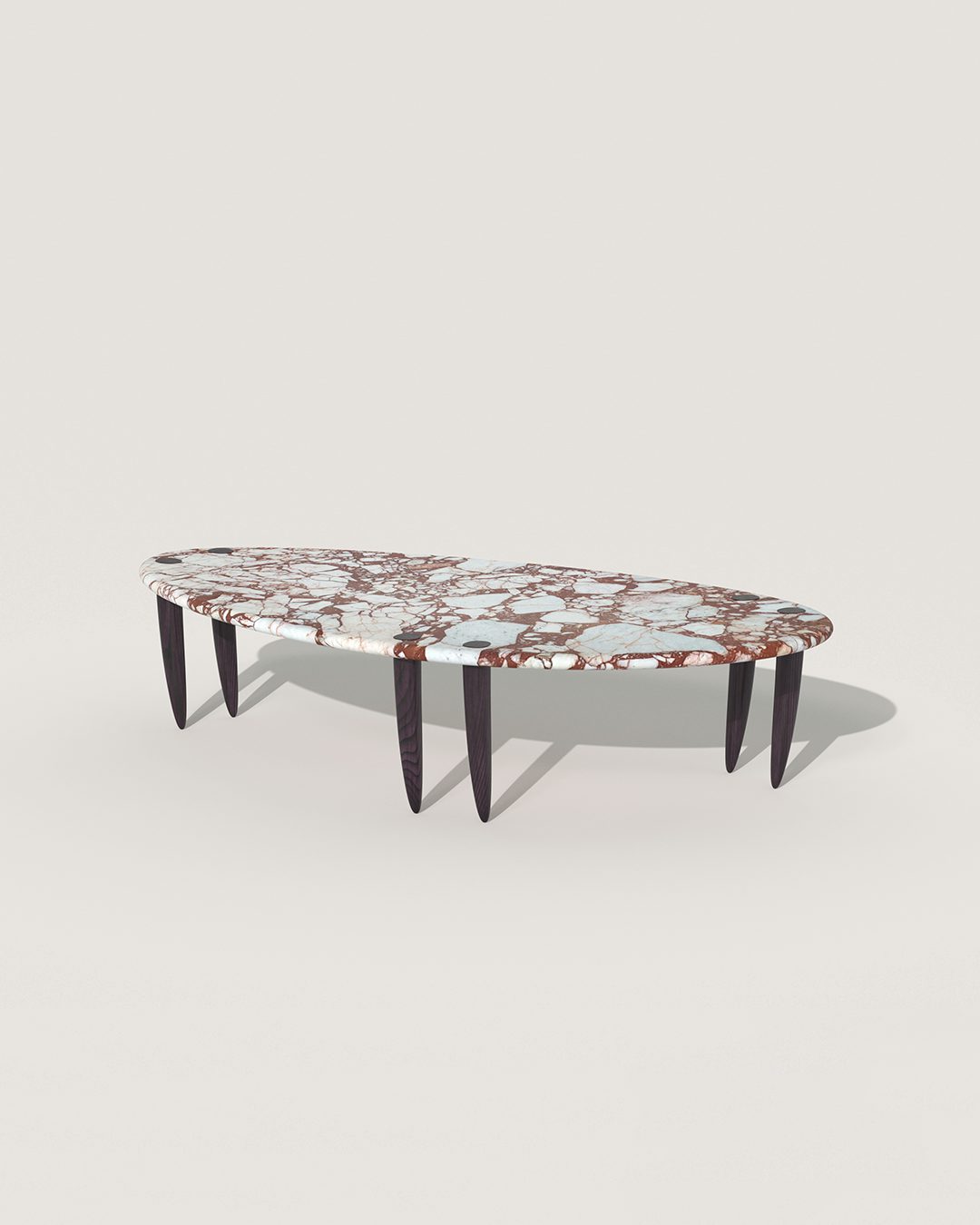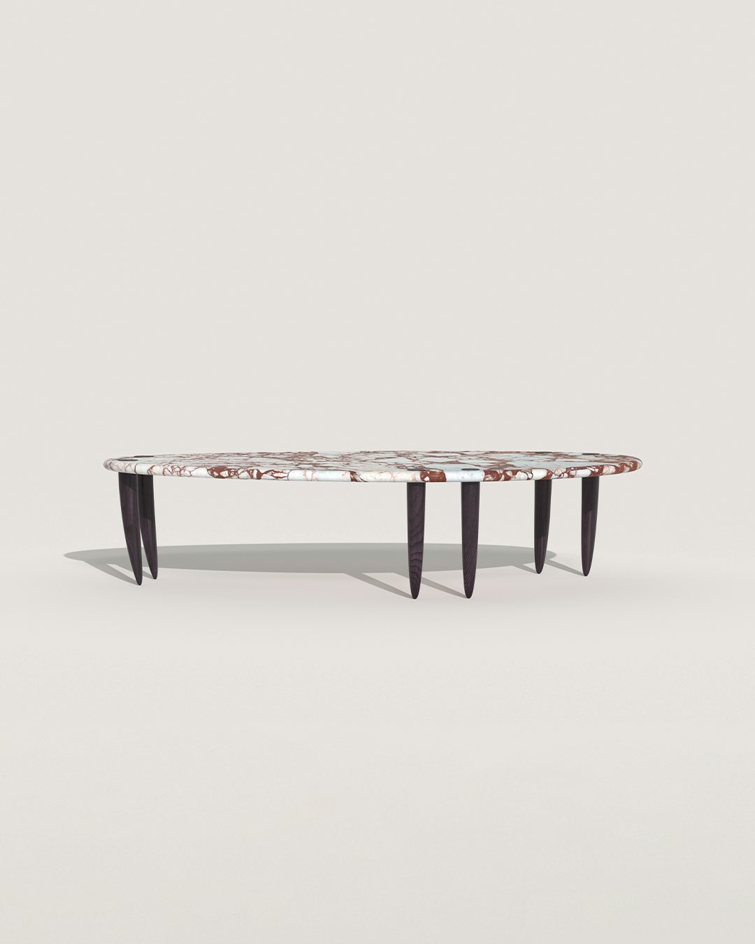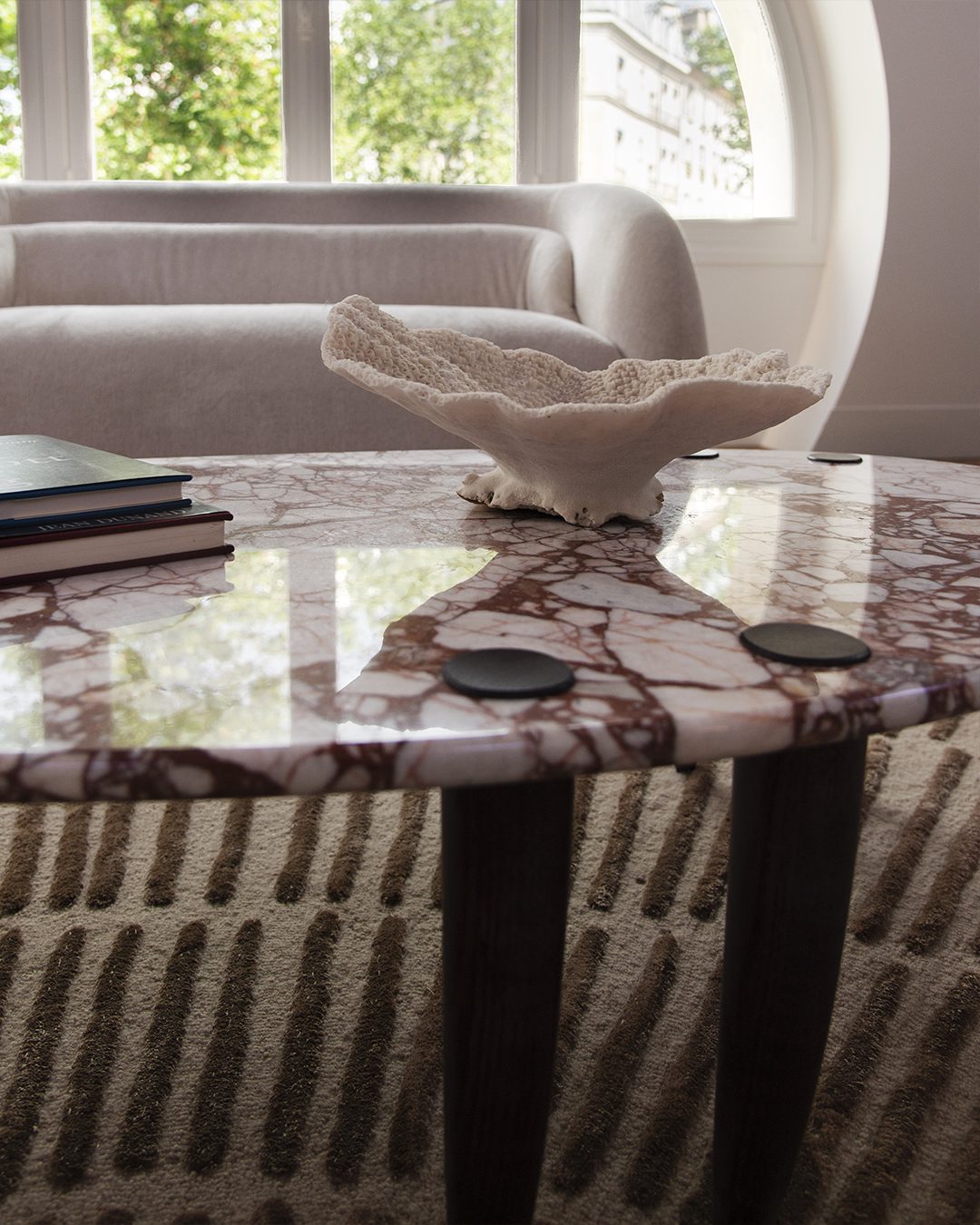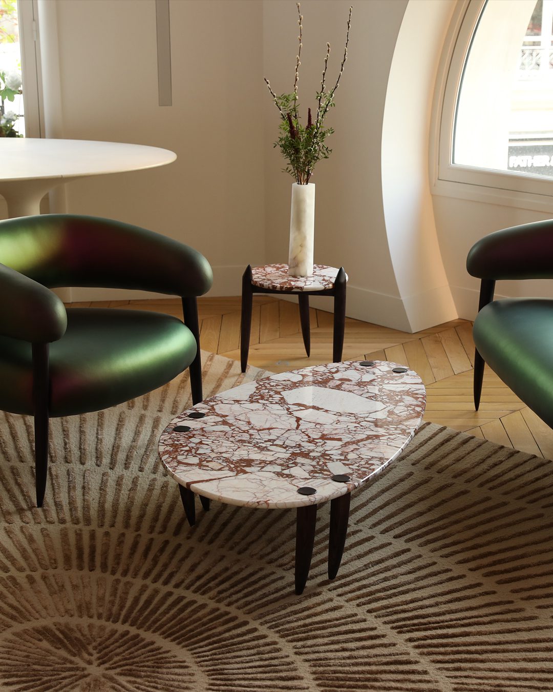 Pour soutenir leurs plateaux encalacatta viola, les tables basses gigogne Morse arborent les pieds emblématiques de la collection, en forme de dents de morse.