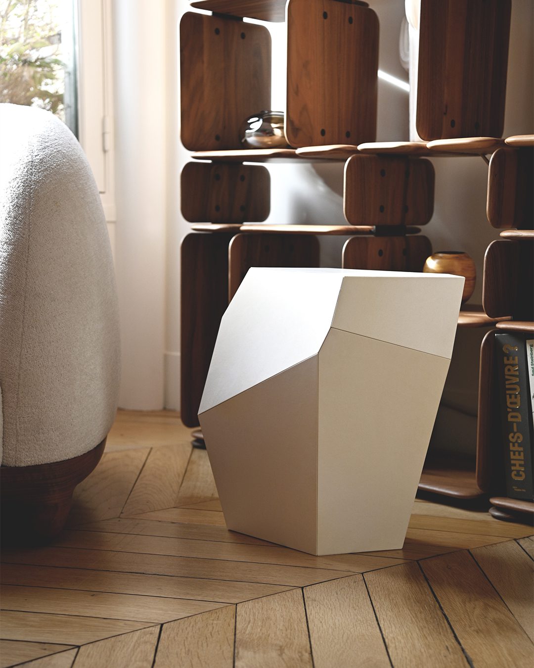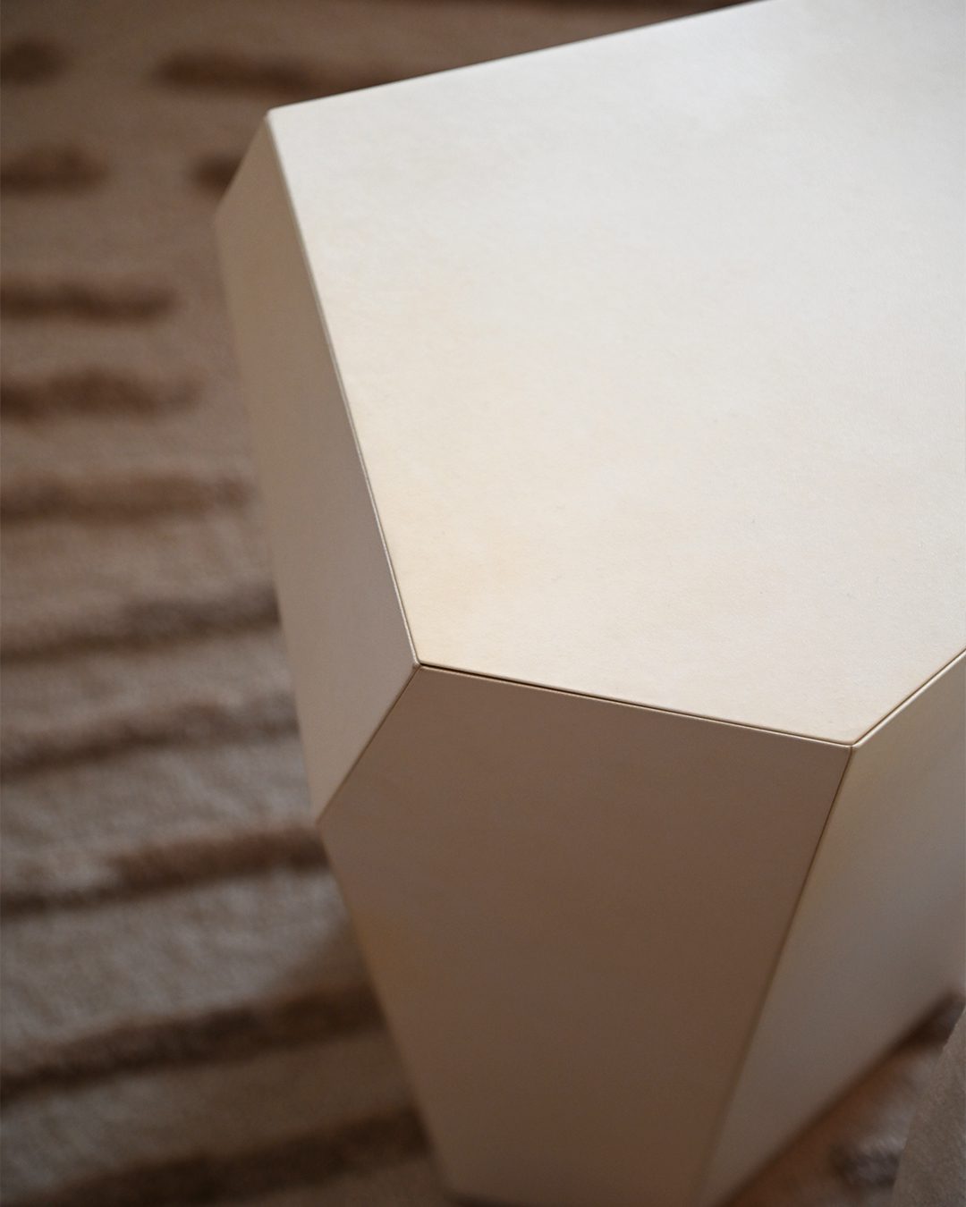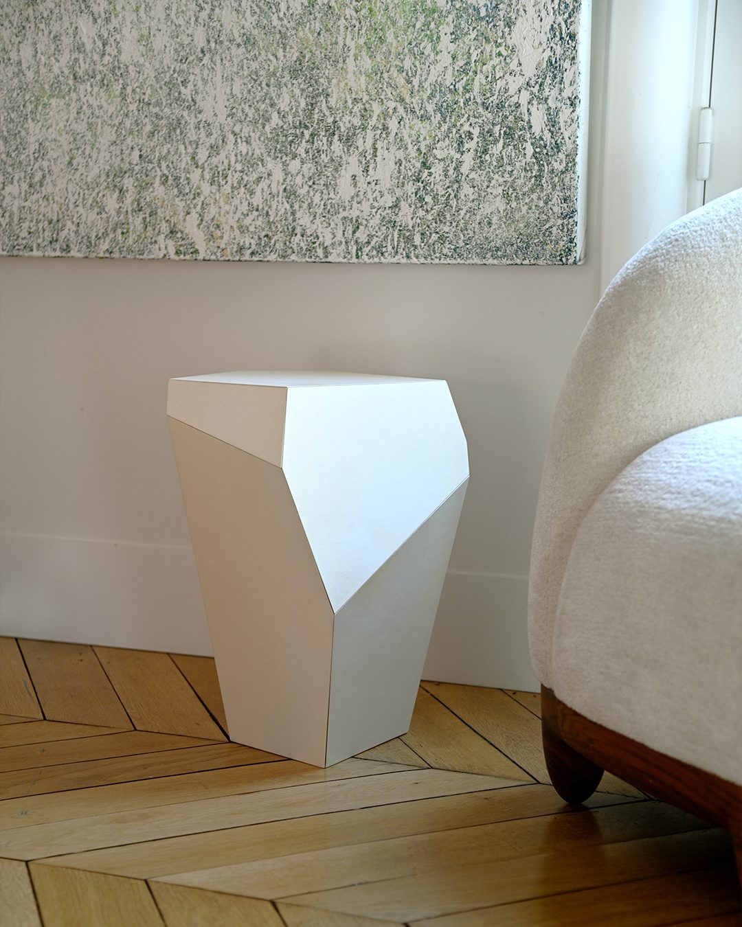 Parchemin est une table d’appoint facettée en parchemin, où la force minérale rencontre le raffinement de l’artisanat. Sa géométrie sculpturale contraste avec la douceur du parchemin, matière vivante qui se patine avec le temps. Une pièce pure et intemporelle, reflet de la vision de Franck Genser — entre simplicité brute et richesse du détail.