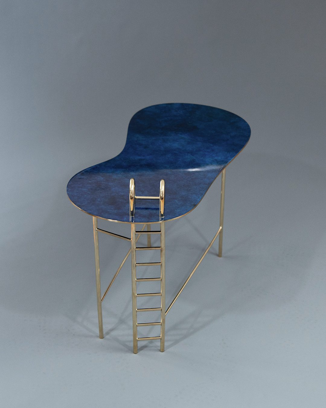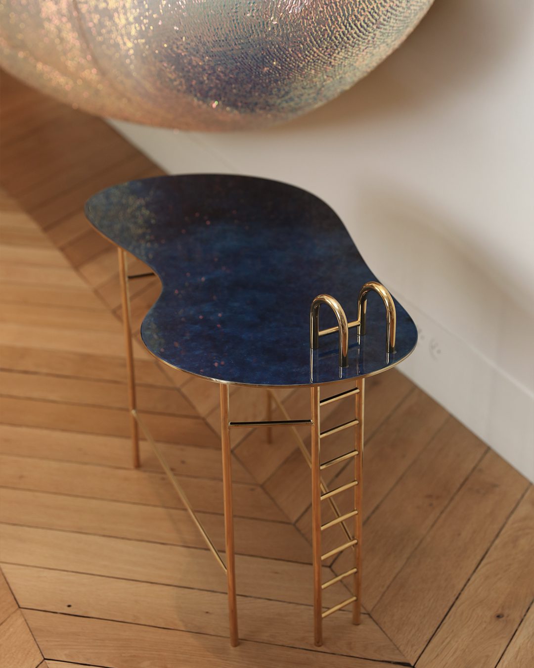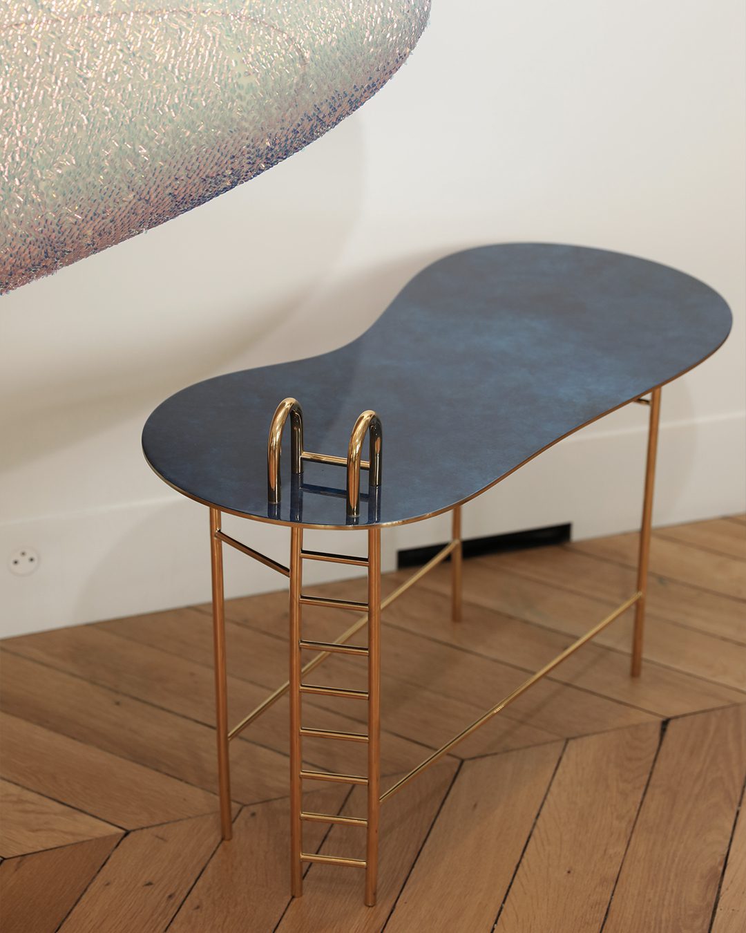 Piscine est une pièce incontournable de la collection table. Elle invite à la détente avec son piètement en forme d’échelle réalisé en laiton ciré. Le plateau est en bronze, avec une patine à chaud qui permet d’apporter cette unique couleur bleue.