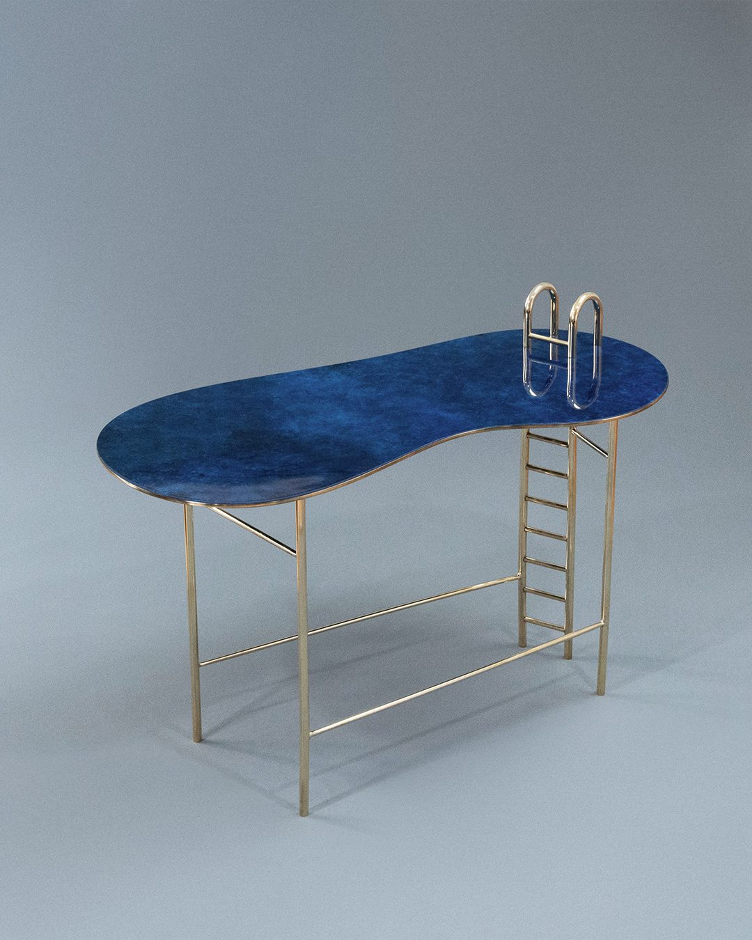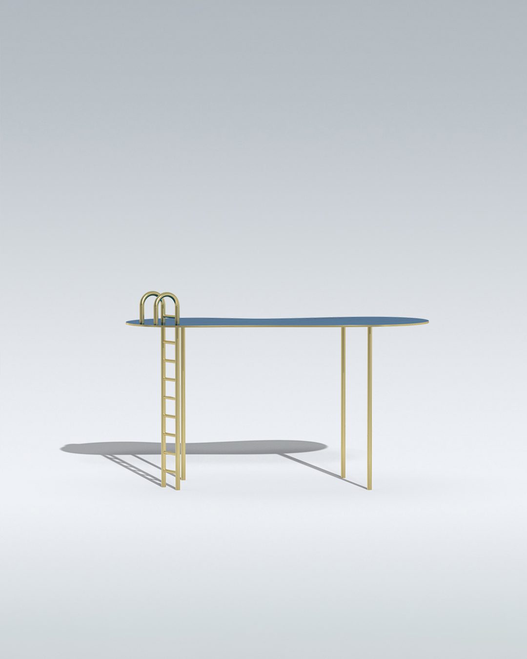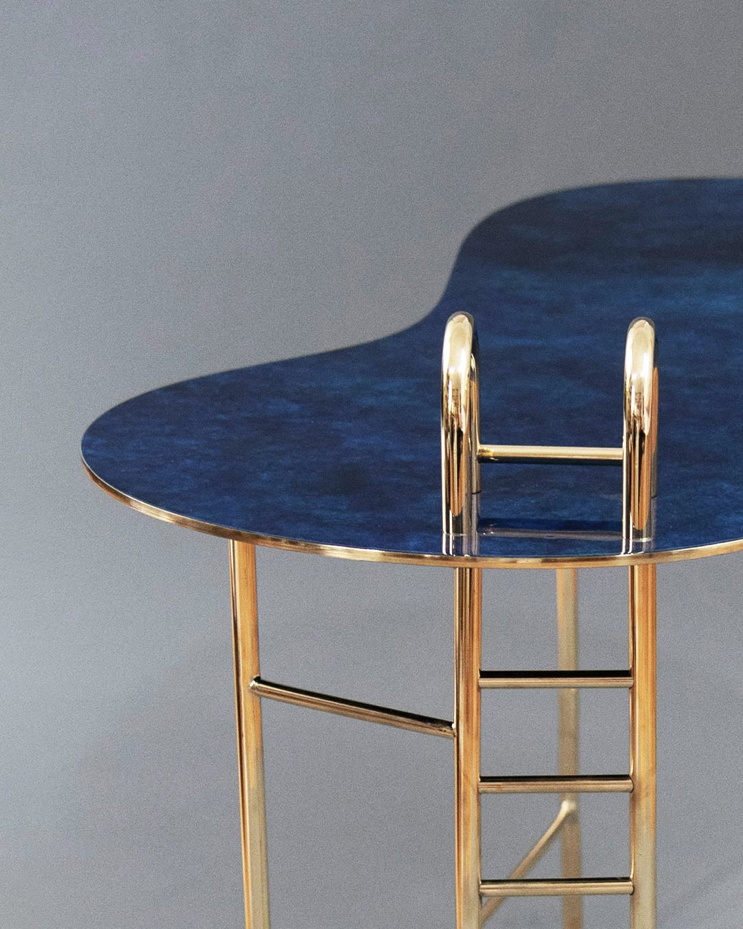 Piscine est une pièce incontournable de la collection table. Elle invite à la détente avec son piètement en forme d’échelle réalisé en laiton ciré. Le plateau est en bronze, avec une patine à chaud qui permet d’apporter cette unique couleur bleue.