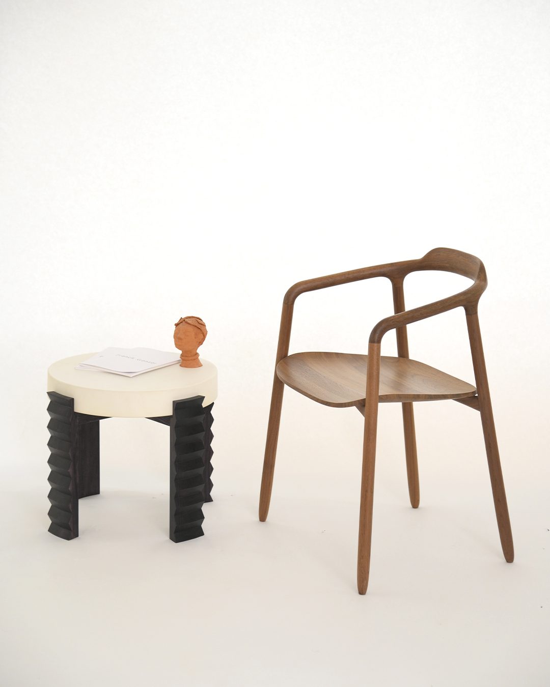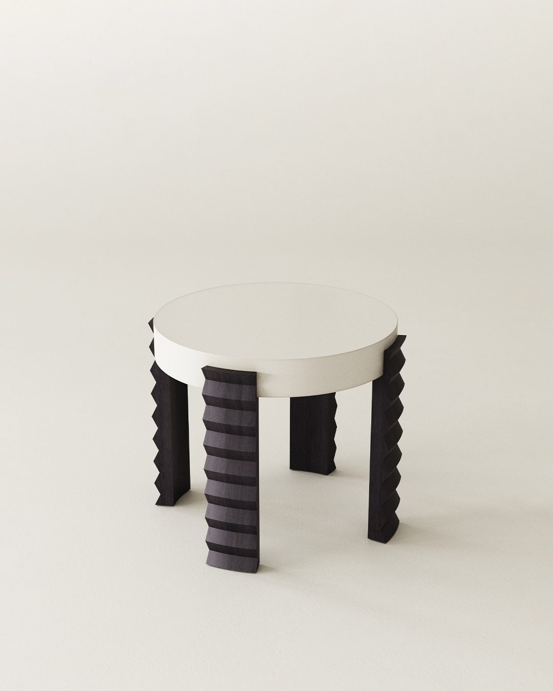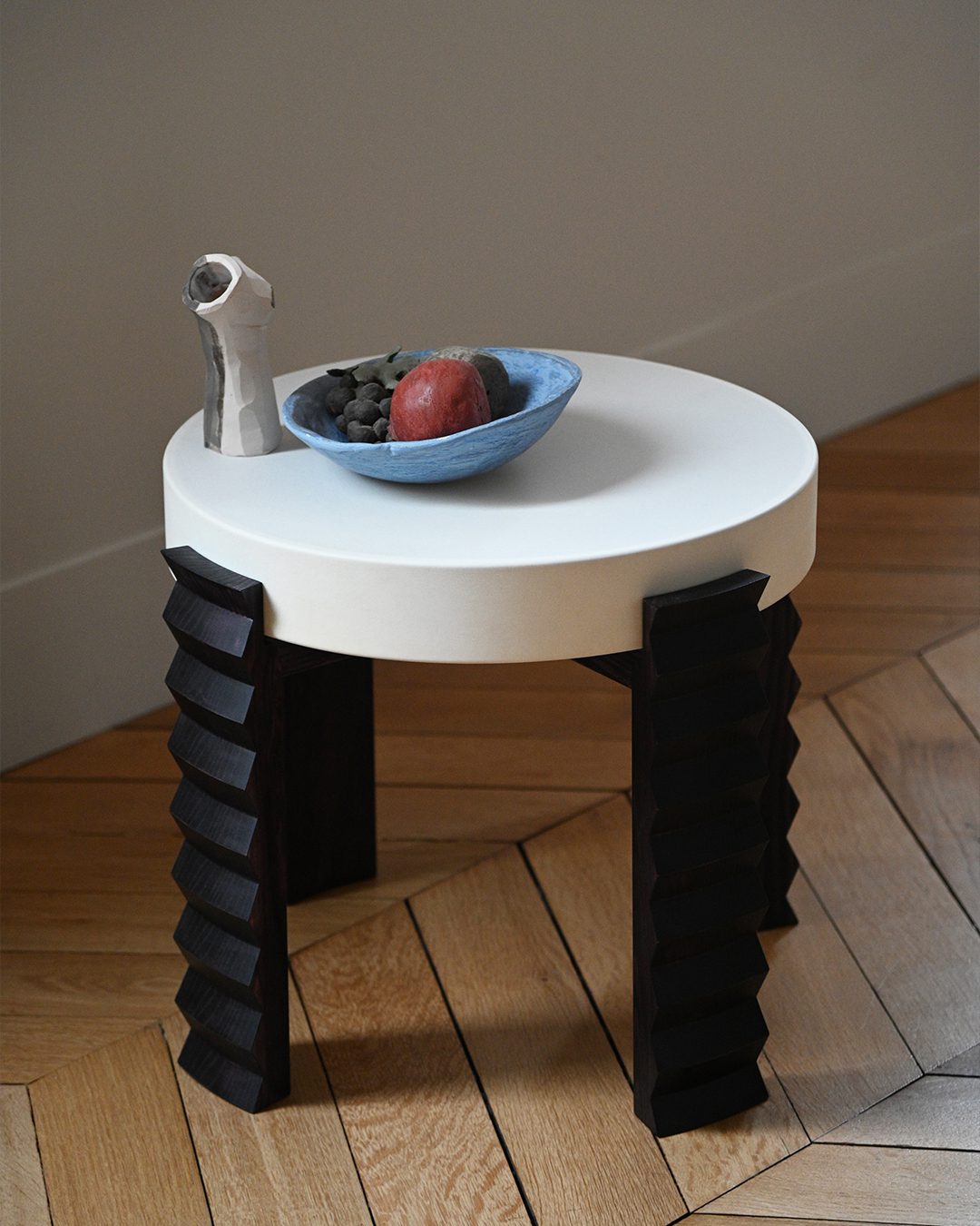 Sculpturale et sensorielle, la table Tam équilibre art et fonctionnalité. Son piètement en frêne teinté aubergine et son plateau en parchemin jouent avec la lumière et les textures. Au moindre effleurement, elle révèle son secret : elle résonne comme un tam-tam, transformant la table d’appoint en une pièce vibrante de rythme et de présence.