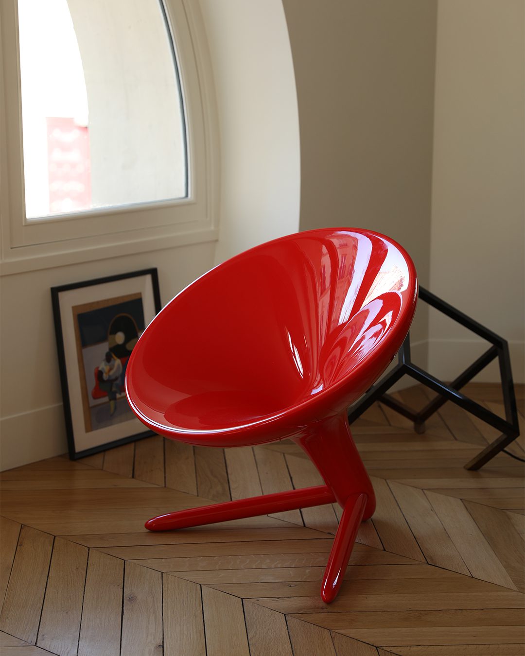 Le fauteuil Trompette, issu de la collection Saint Germain, se veut joyeux par ses couleurs et original par sa forme. En composite moulé puis laqué, une large palette de couleurs douces viendront faire vibrer les décors intérieurs.