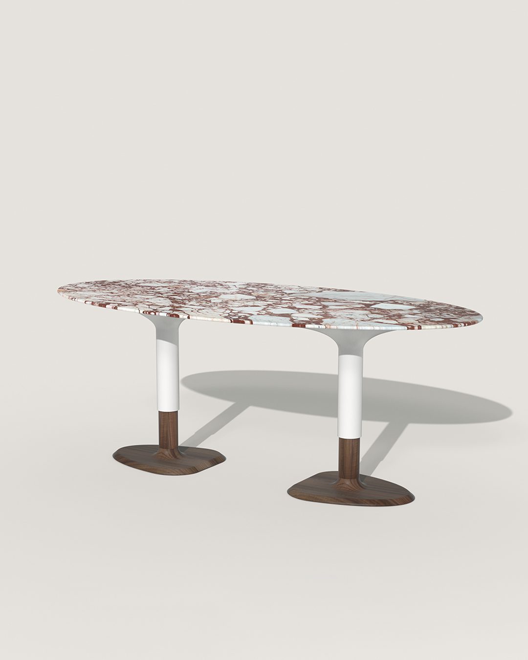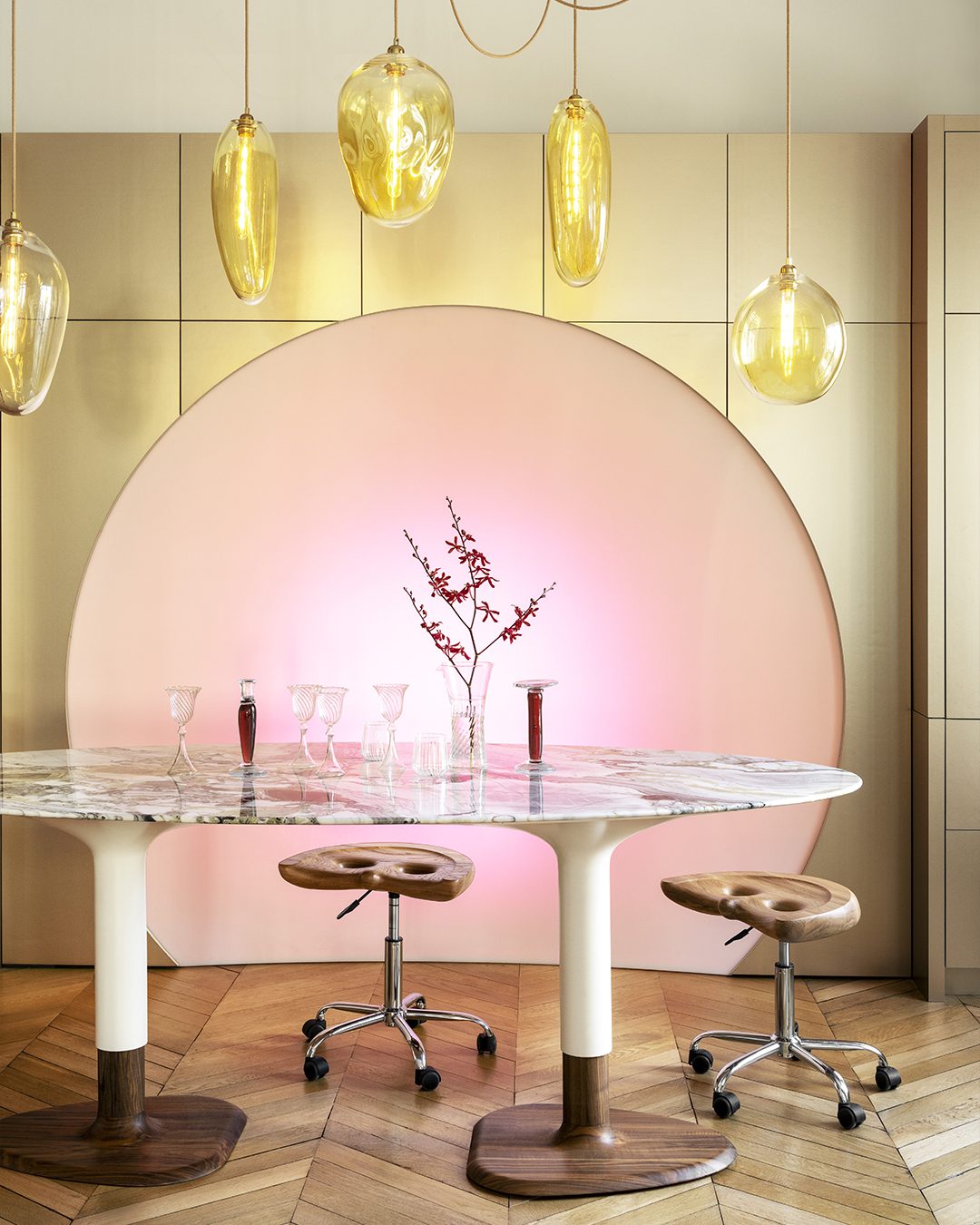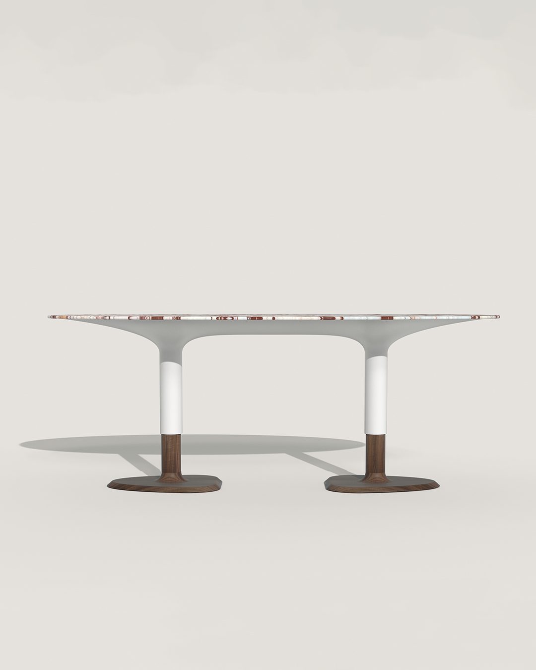 La table Vésuve « up and down » allie tout en subtilité, fonctionnalité et formes affirmées. Première table automatisée dans l'univers du mobilier de collection, elle s'adapte au besoin de son environnement que ce soit pour un diner, une réunion, un cocktail, une table de travail en étant toujours à la (bonne) hauteur. Piètement en noyer et plateau en marbre Calacatta viola.